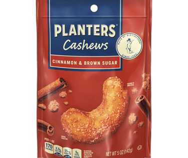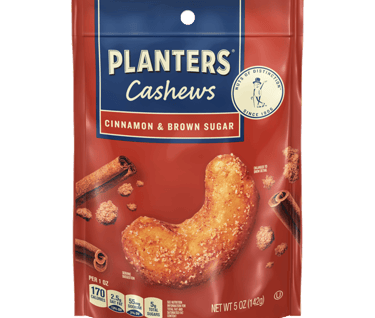 NEW PLANTERS Cinnamon Brown Sugar Cashews: These delectable treats merge the classic sweetness of cinnamon and brown sugar with the salty, crunchy precision of our roasted cashews, a can't-miss combination.