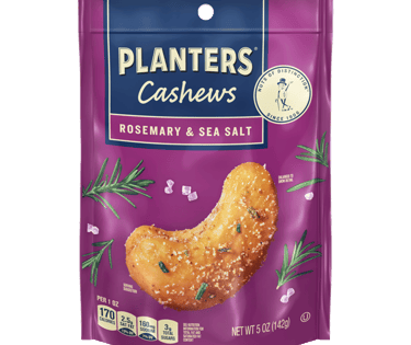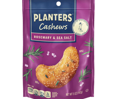 NEW PLANTERS Rosemary and Sea Salt Cashews: This flavor blends the taste and aroma of rosemary with the sharp, satisfying bite of sea salt, a perfectly balanced snack sure to please the senses.