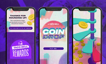For a limited time, when Rewards Members opt to Round Up in the Taco Bell mobile app and check out, they will receive a digital "coin" and 10 bonus loyalty points added to their Taco Bell Rewards account to go toward their next reward (limit 1 per day). After placing a mobile order and "rounding up," customers will see an updated Coin Drop banner on the app's homepage where they can either practice or use their digital "coins" to play the game for real. The objective is to land their virtual "coin" on the lowest pink paddle to attempt to win a free Taco Bell menu item. Prizes include the customer's choice of Cinnamon Twists, a Crunchy Taco, or a Bean Burrito—the same reward choices as the original Coin Drop game.